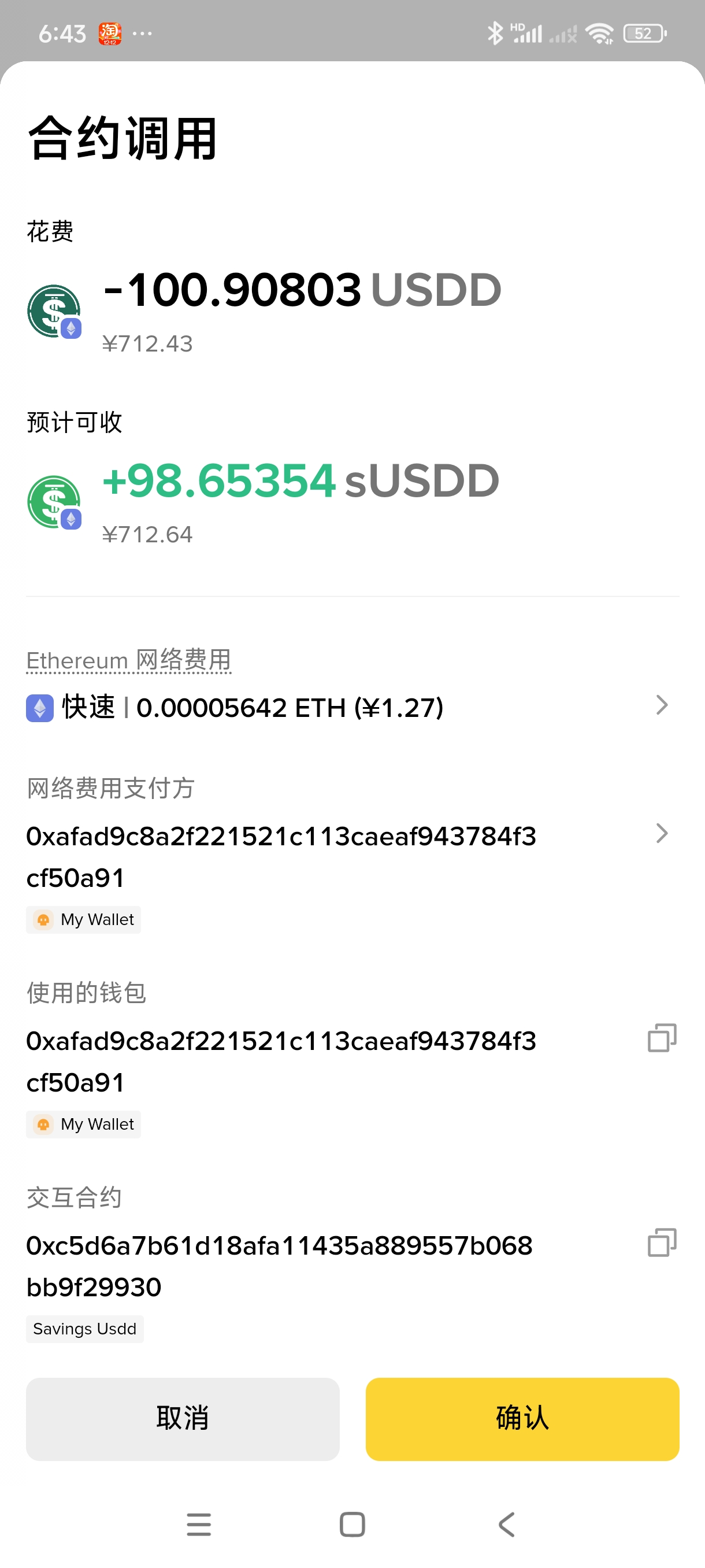 Look at the picture, I used 101U to exchange for USDD, then exchanged it for sUSDD to stake, and finally had 98.6U left. The expected daily interest is 0.04U*29 days=1.16U, plus the transaction fee for exchanging to the ETH chain, I’m the one being taken advantage of! I got scammed.