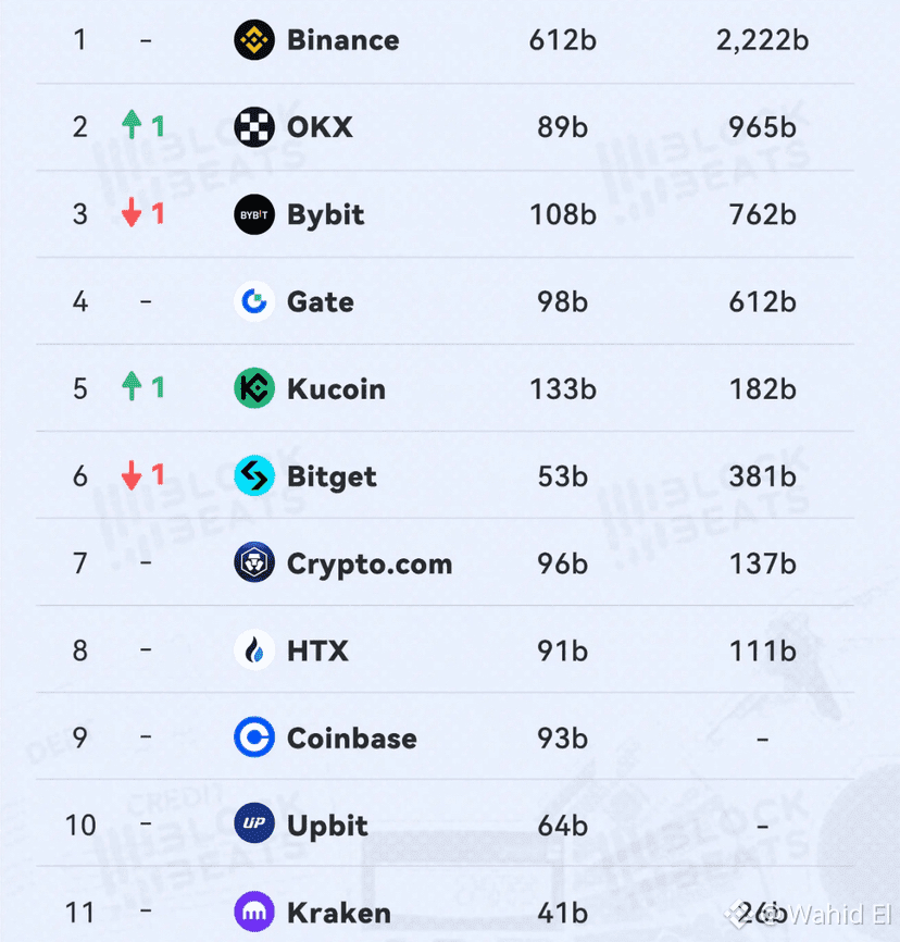 في نوفمبر 2025، انخفض حجم التداول الفوري ل CEXs السائدة بنسبة 27٪ مقارنة بأكتوبر. كان أكبر ثلاثة متراجعين هم Coinbase -5.42٪ و Kucoin -16.50٪ و Crypto.com -17.72٪. كانت الثلاثة السفلية OKX -27.18٪، وBybit -31.42٪، وGate -43.91٪.