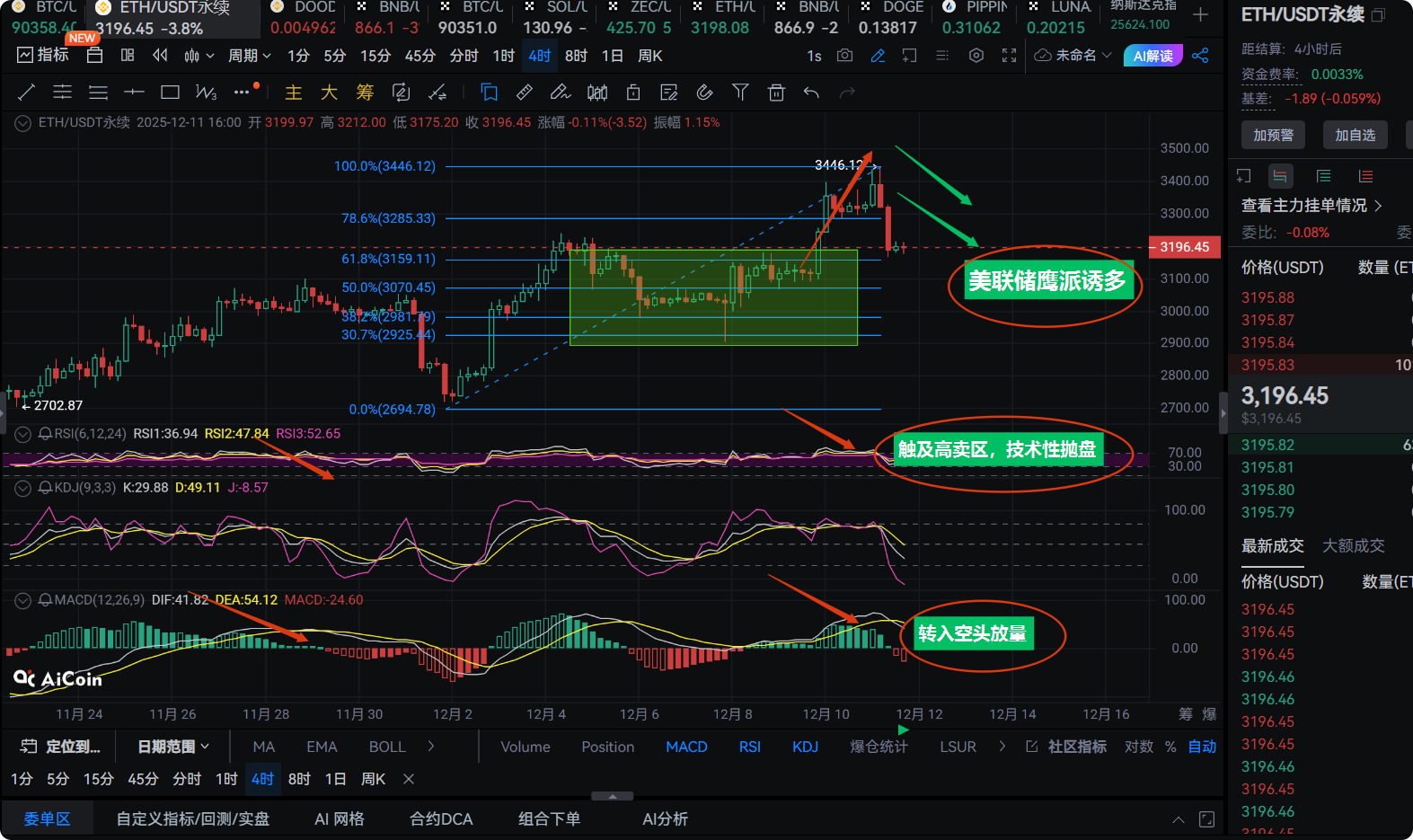 At three o'clock in the morning, the moment the Federal Reserve made its decision, I knew something was going to happen just by looking at the 4-hour candlestick chart: a 25 basis point cut was expected, but the dot plot suddenly said 'one less cut next year', which is like going to a bar and just opening a bottle of wine, only for the owner to tell you 'this is the last bottle, we close after this' — the market's hopes for easing were instantly dashed. Sure enough, ETH surged to 3446 along with BTC, just touching the 100% Fibonacci resistance level, only to be smashed down into 'free fall' by large sell orders, plunging 120 dollars within half an hour, crushing over 110,000 long positions that chased the high this morning.