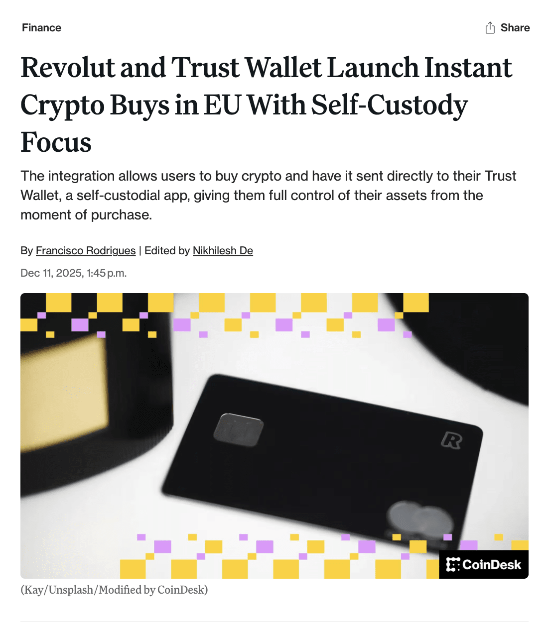 Revolut and Trust Wallet launched instant cryptocurrency purchases in the EU. Details reported by #Coindesk.