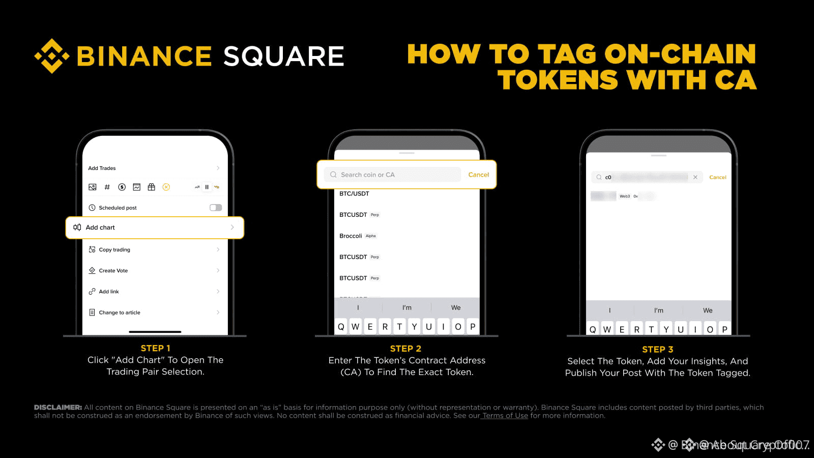 You can now tag and mention all types of on-chain tokens directly in your Binance Square posts and live - even the token is not listed on Binance Spot, Futures or Alpha. This new feature links your content directly to token pages by mentioning their contract address (CA), boosting your post’s visibility and helping you engage effortlessly with the right token communities—eliminating the need to search or navigate between pages.