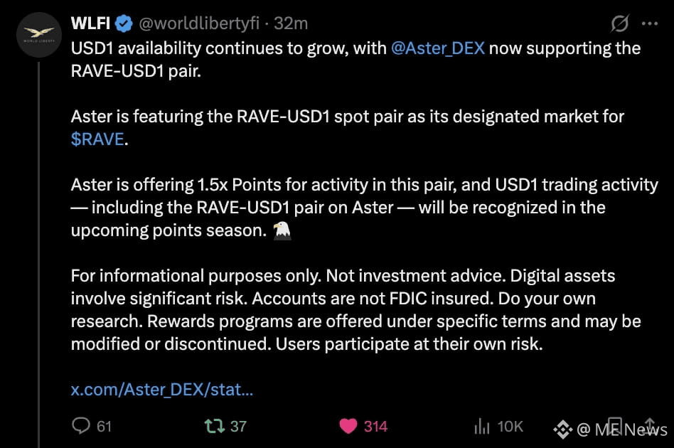 Aster 今日宣布将于 12 月 12 日 12:00 UTC 正式上线 RAVE/USD1 现货交易对,并推出平台史上最高的 1.5× 交易积分(Symbol Boost)加成。与此同时,WLFI(World Liberty Financial)将为 RAVE/USD1 交易者提供积分奖励扶持,为行业首次,象征着对 RaveDAO 生态潜力与社区基础的高度认可。