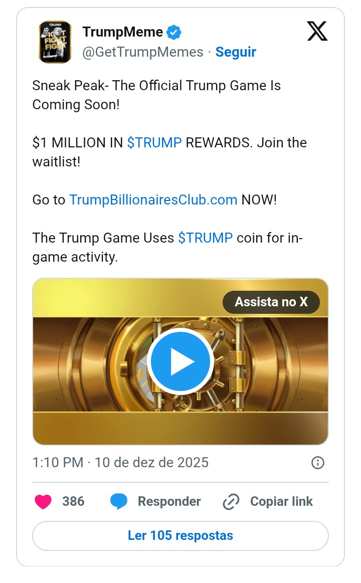 The Trump Billionaires Club, a mobile game inspired by Donald Trump and integrated with cryptocurrencies, is set to launch at the end of this year. This information was announced on Tuesday (9) on X by the official account of the memecoin Official Trump (TRUMP), created on the Solana network.