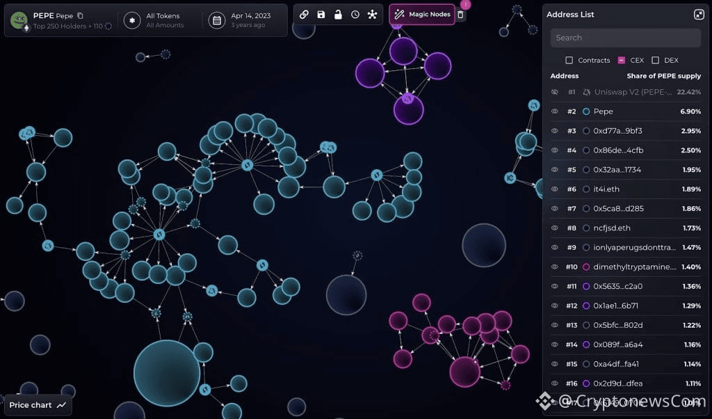 According to the data, roughly 30% of PEPE’s genesis supply was bundled into a cluster of wallets connected to one entity at the time of the token’s April 2023 launch.