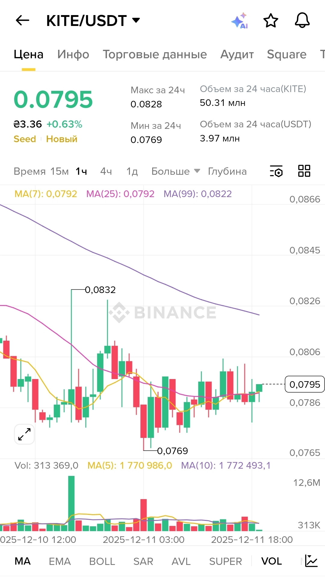When I look at the technical indicators, I see that $KITE is currently trading at 0.0795, which is approximately 0.63% higher than it was before. The chart clearly shows how the price peaked around 0.0832 and then retraced to a minimum of 0.0769. This is a classic story – a spike in interest, followed by a correction. Now the coin seems to be stuck in a range, trying to determine its direction. The moving averages show an interesting picture: MA(7) and MA(25) have nearly converged at 0.0792, while MA(99) is slightly higher at 0.0822. This indicates that short-term and mid-term trends are aligning, but the long-term trend is still exerting pressure from above.