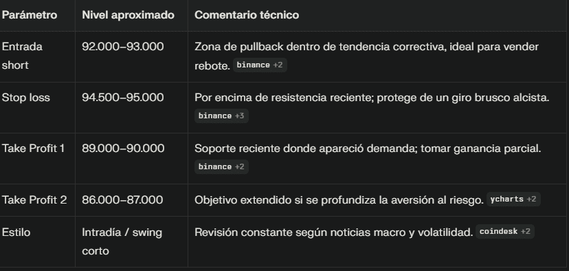 Ideal entry zone: bounce towards the 92,000–93,000 USD zone if the price comes from below and shows clear rejection (upper wicks, selling volume).