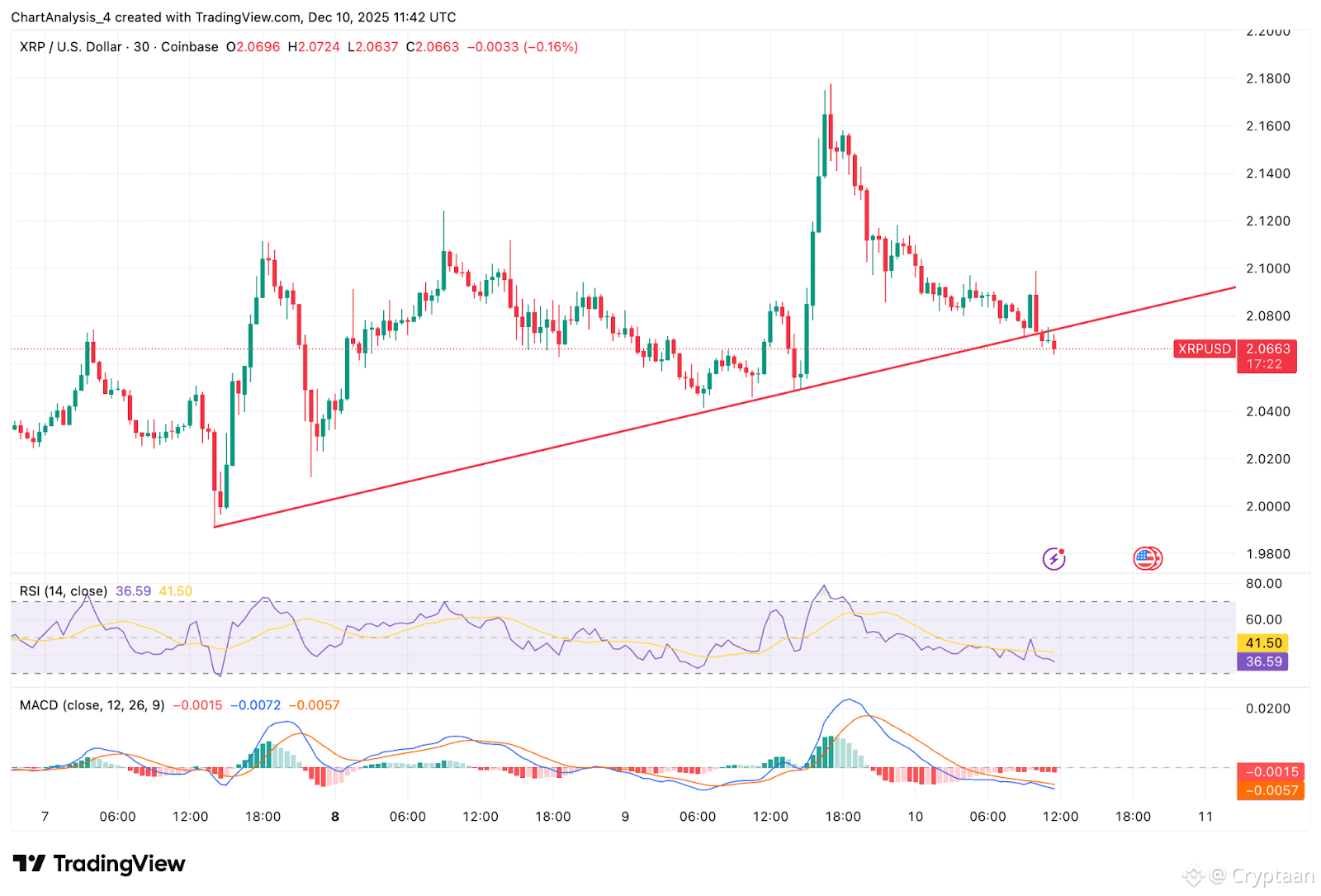 Intraday action confirms that weakness. The 30 minute chart shows XRP losing its rising trendline after repeated rejection near $2.10. RSI sits near 36, showing declining momentum, while MACD has crossed into negative territory. These conditions typically lead to extended chop or a retest of deeper support.