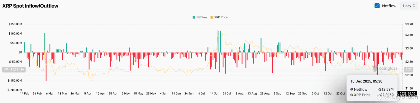 XRP recorded more than $12 million in net outflows today, according to Coinglass. Outflows have dominated the last several sessions and signal that traders continue to move supply back onto exchanges instead of holding.