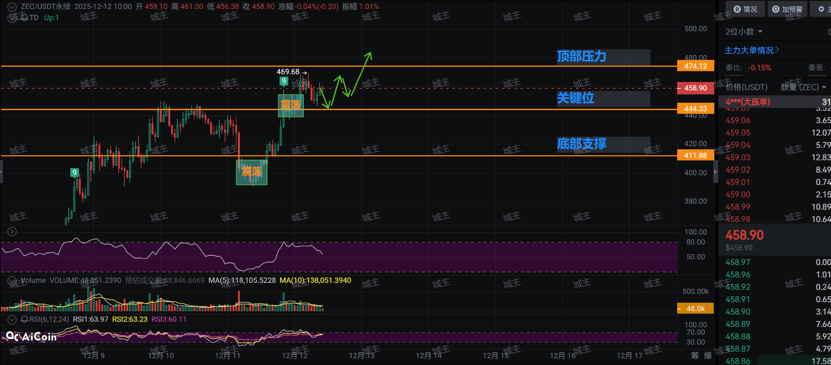 Personal opinion of the city lord: The Zcash bulls have reestablished! 446 and 411 are strong supports, steady as a mountain. 470 has been tested multiple times without breaking, and the probability of hitting 550 tonight is very high. The technical RSI is neutral to strong, trading volume continues to increase, and treasury bond funds are pouring in. This wave of increase has solid support! Holders should stay steady, and those without positions should pay attention to the opportunity for a pullback. The city lord will accompany you to earn all the way!