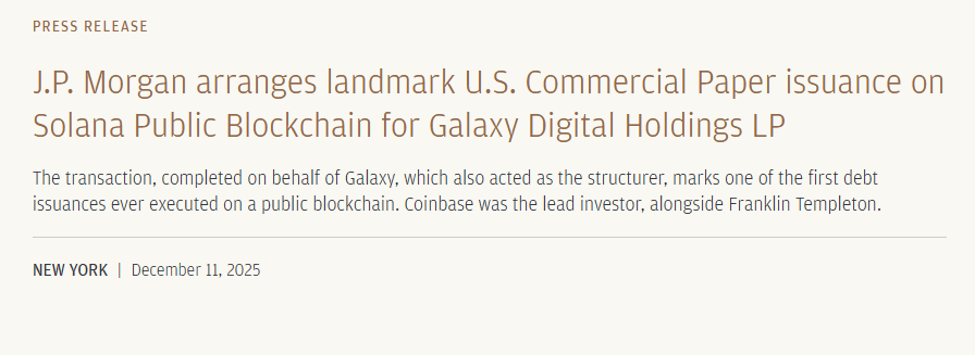 Well-known investment bank JPMorgan has announced that it has assisted crypto asset management firm Galaxy Digital's subsidiary in issuing commercial paper on the Solana blockchain, reportedly one of the first debt issuance cases fully executed on a public blockchain, marking a milestone.