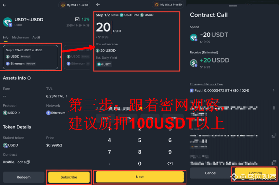 Step 3: After completing the first time, it will automatically skip to Step 2. If it doesn't skip, manually select [Step 2] - [Subscribe], repeat the operation, and after confirming, click [Approve USDD] [Confirm].