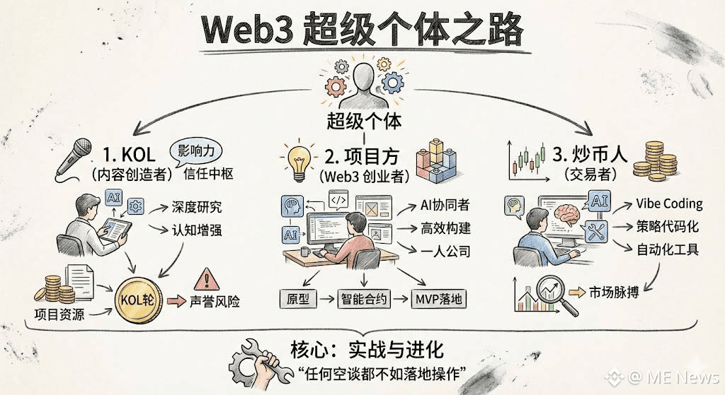 无论是哪条路径,实战都是关键,任何空谈都不如落地操作。超级个体需要的是「一个自我驱动的系统」。KOL 需要持续创作,创业者需要持续开发,交易员需要持续交易,每一步都以实践检验并进化。