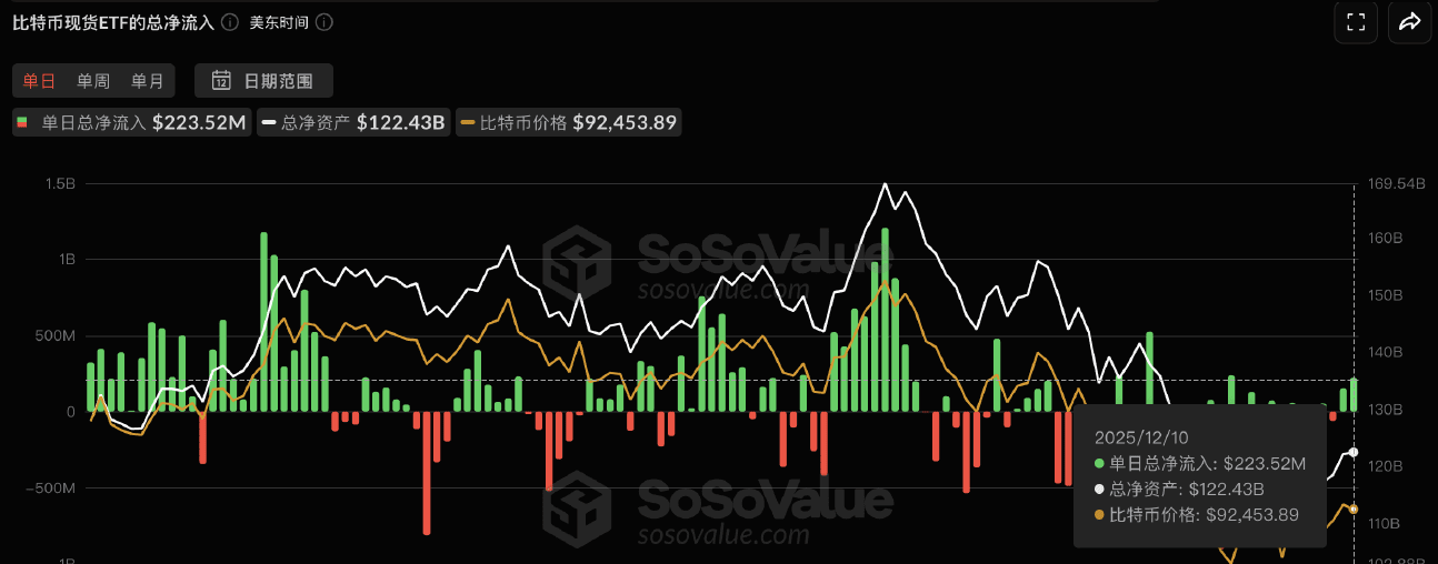 On December 10, BTC saw an inflow of 223 million USD, with net inflows for 2 consecutive days. ETH also saw an inflow of 57 million USD, with net inflows for 3 consecutive days.