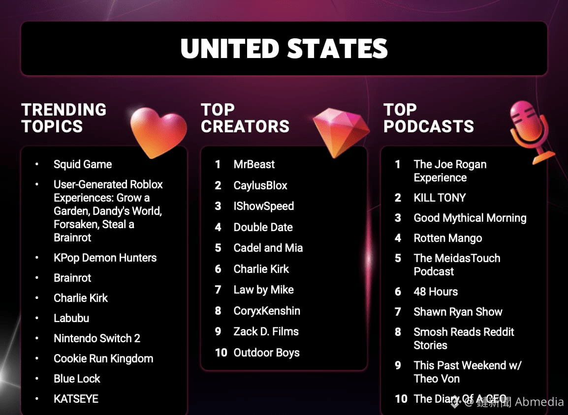 YouTube 成立至今滿 20 年,平台內容的規模、型態與語言多元程度不斷擴張。2025 年美國創作者更呈現前所未有的多元化,從 3D 列印藝術創作、獨立製作動畫、混搭真人秀的約會實境節目到遊戲與時事談話直播都吸引大量觀眾,雖然製作內容完全不相同,但許多崛起的 Youtube 創作者有一個共同特徵,他們積極製作各種新奇內容,深化與觀眾之間的連結,以下為 Youtube 年終報告分析。