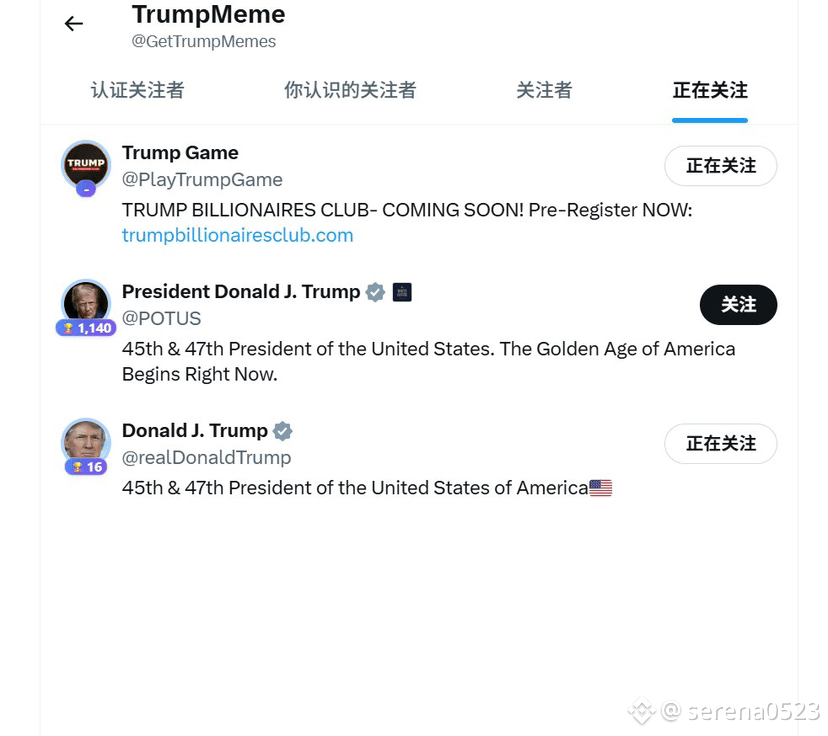 进一步通过Surf分析,该项目由由特朗普长期合作伙伴Bill Zanker主导开发,Bill Zanker此前参与了特朗普NFT系列、 $TRUMP meme币等项目,另外目前游戏的主要宣发就是由 $TRUMP 主体账号 @GetTrumpMemes 进行,目前该账号仅关注了三人,其中2个是特朗普本人账号,最新关注的就是这个特朗普大富翁游戏的账号 @GetTrumpMemes