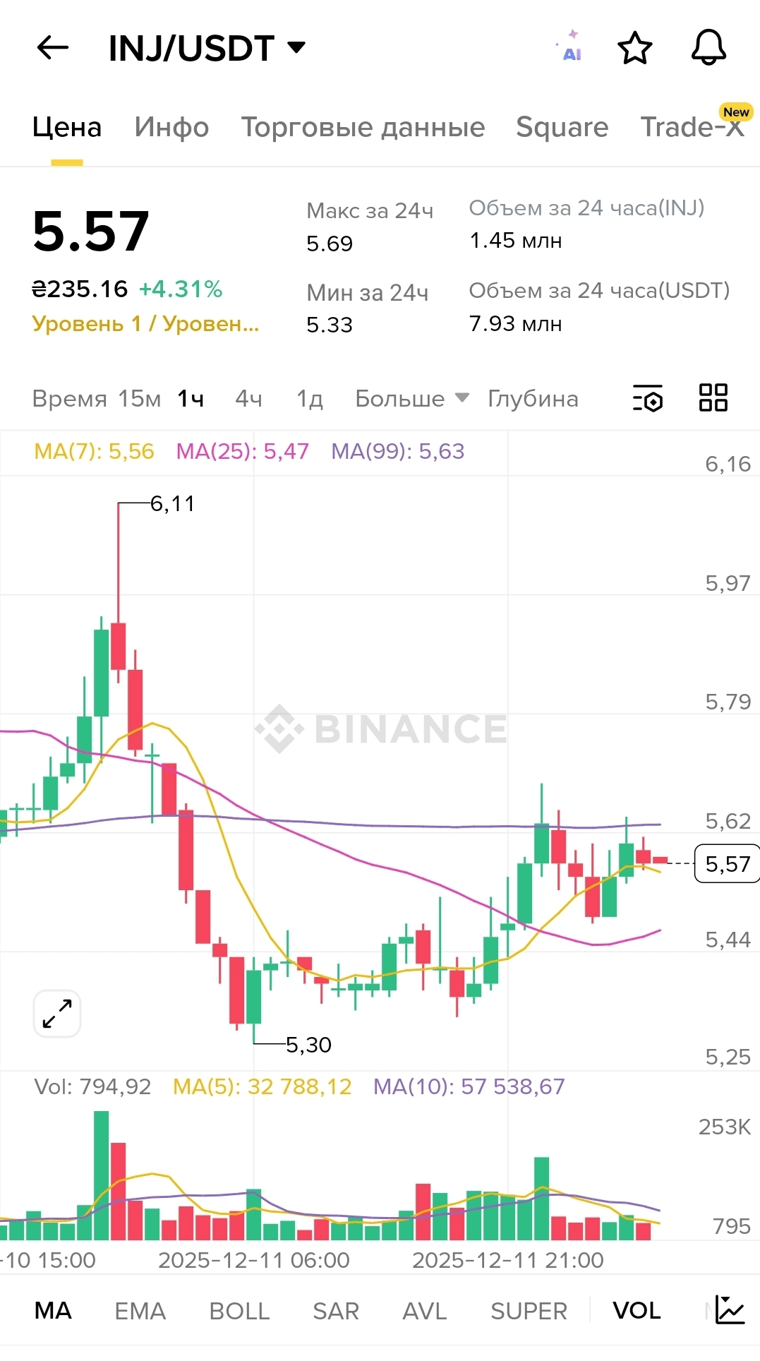 I'm looking at the INJ/USDT chart and I see an interesting picture – the token has risen by 4.31% and is currently trading at 5.57. It seems good, but when you start to dig deeper, you realize that this is not a simple story at all. After a sharp rise to 6.11, the price collapsed to a minimum of 5.30, and now we are observing an attempt at recovery. The moving averages show an interesting dynamic: MA(7) at 5.56, MA(25) slightly lower at 5.47, and MA(99) higher at 5.63. This indicates that the short-term picture looks better than the medium-term one, but the long-term trend has not yet been definitively established.