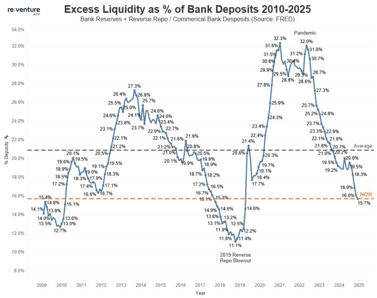 2022-2024: Interest rate hikes and balance sheet reduction, liquidity rapidly shrank to combat high inflation. The Federal Reserve began an aggressive interest rate hike cycle while simultaneously conducting 'quantitative tightening' (QT), which means stopping the reinvestment of maturing bonds and letting them naturally mature out of the balance sheet. This led to a significant decrease in bank reserves, with the proportion of excess liquidity dropping from a high of 32% to around 19.5% by the end of 2024, close to historical average levels.