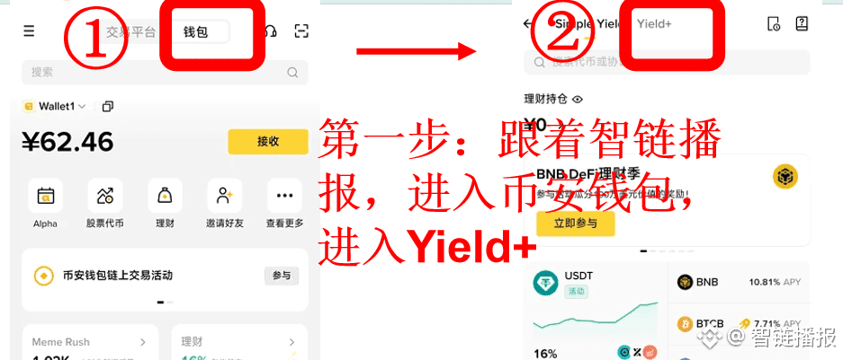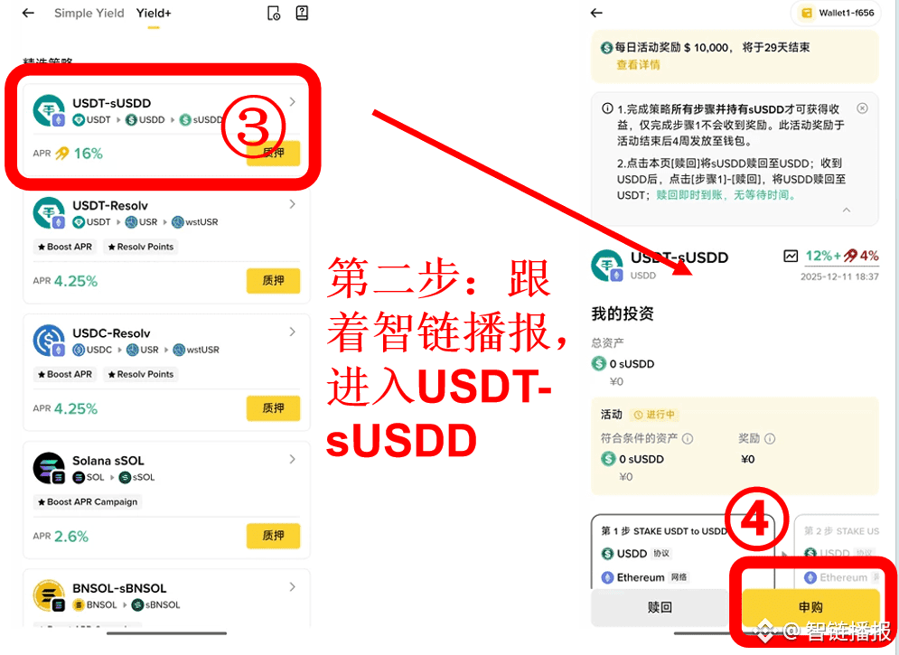 第一步:进入币安WEB3钱包,按照我的图,找到入口,使用币安钱包登录 -【理财】-【Yield+】-【USDT-sUSDD】