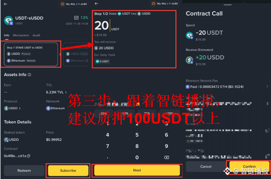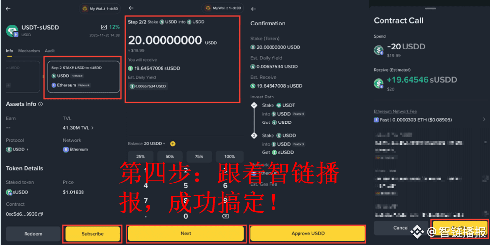 第三步:首次完成后多会自动跳转步骤 2,未跳转则手动选【步骤2】-【订阅】重复操作,确认后点【批准USDD】【确认】。