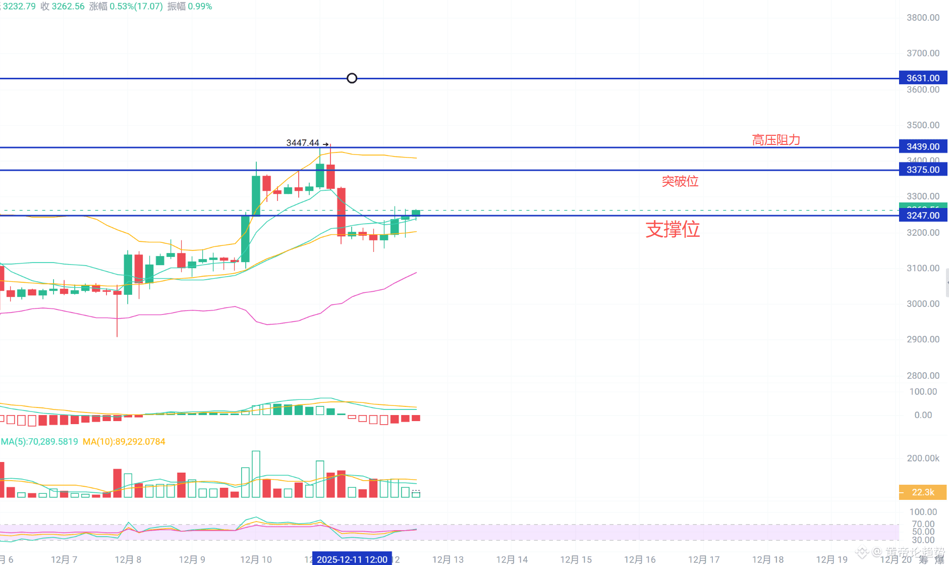 巨鲸囤积:链上数据显示,近期巨鲸五天内购入超28万个ETH,价值约10亿美元,大额积累是积极信号。机构资金入场:2025年8月以太坊ETF单日净流入超10亿美元,12月8日再次流入3550万美元,贝莱德买入2370万美元,传统金融机构增加配置。关键技术位突破:截至2025年12月10 - 11日,ETH价格在3200美元附近,3247支撑位,3375和3439阻力位,突破后目标看3631美元。