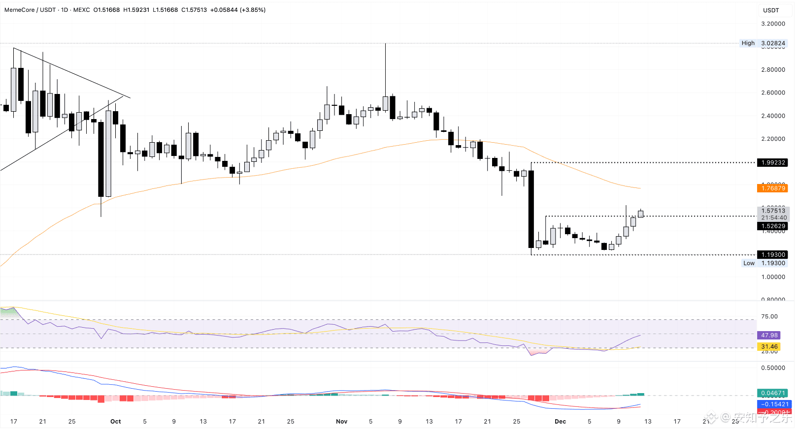 如果 MemeCore 跌破 1.52 美元,那原本的双底形态就算失效,短期跌势可能会继续,一路下探到 11 月 27 日的低点 1.19 美元。