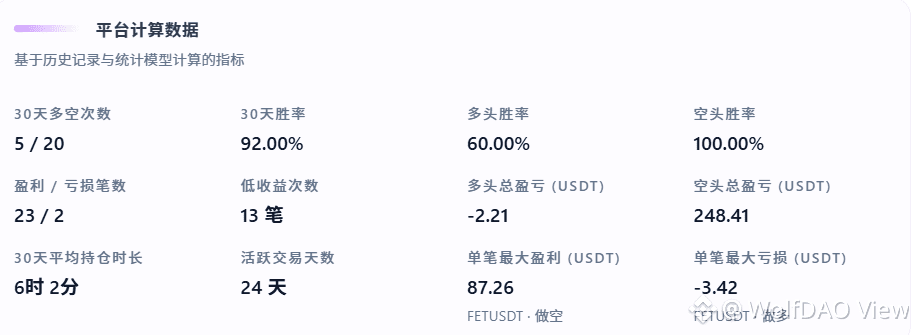 盈利核心靠「本垒打」:2 笔关键交易(FET 空单赚 87.26USDT、ETH 空单赚 68.88USDT)贡献了 64.5% 的总盈利,其余多为「凑数刷单」。