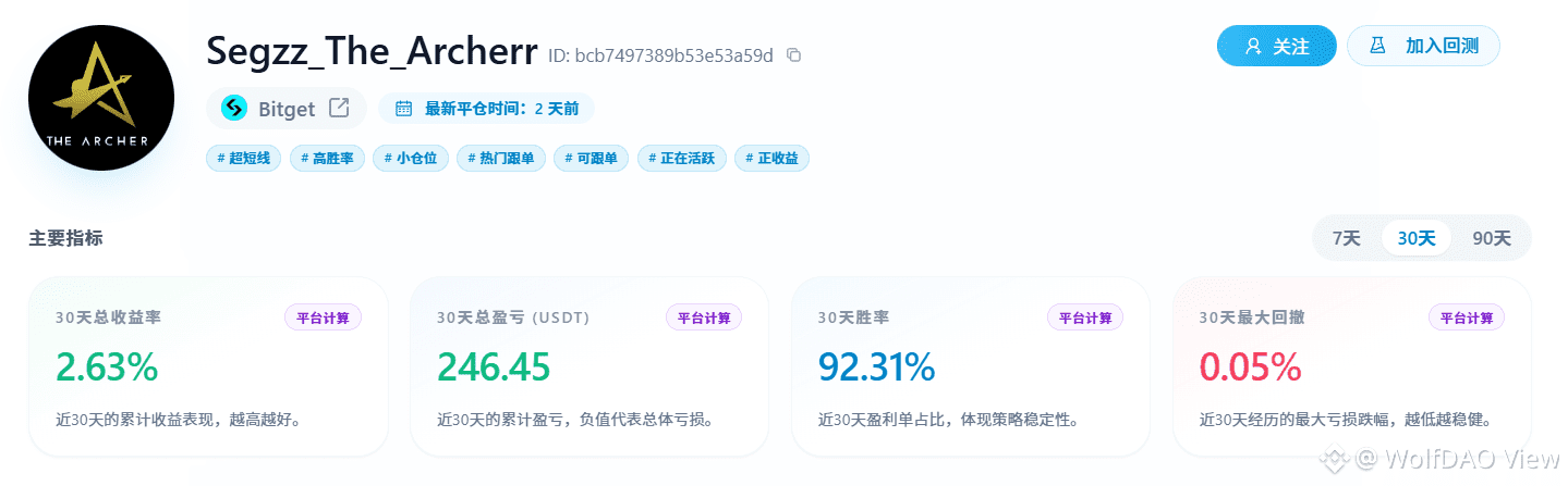 Segzz_The_Archerr 是一位风格激进的短线交易者,漂亮的胜率数据背后,是微利刷单、亏多赚少、资产集中的潜在风险。跟单者集体亏损的历史已经证明,其策略不适合跟单模式。若选择参与,务必以极小资金 + 严格止损为前提;若追求稳健,观望是更理性的选择。