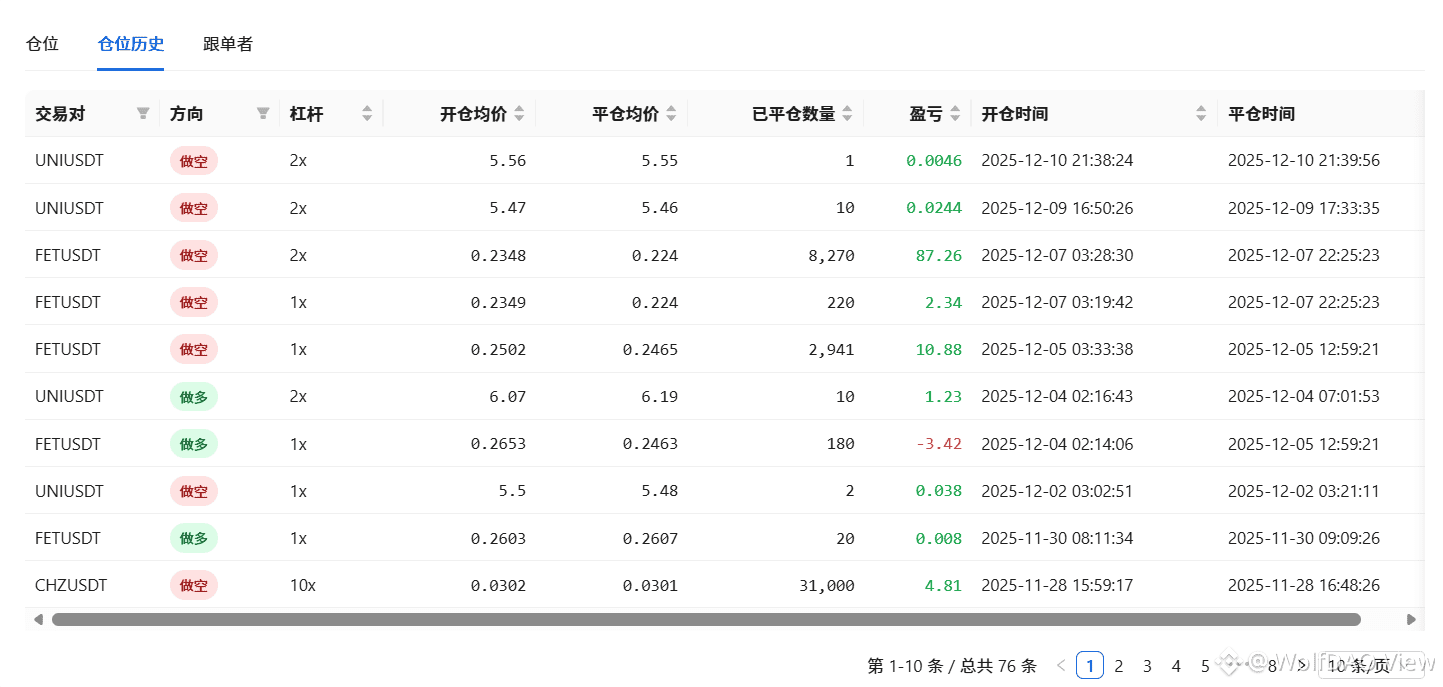超过一半交易聚焦 FET,其余分散在 UNI、DOGE 等币种 —— 押对 FET 能赚,但一旦 FET 暴跌,账户将面临大幅回撤,无对冲空间。