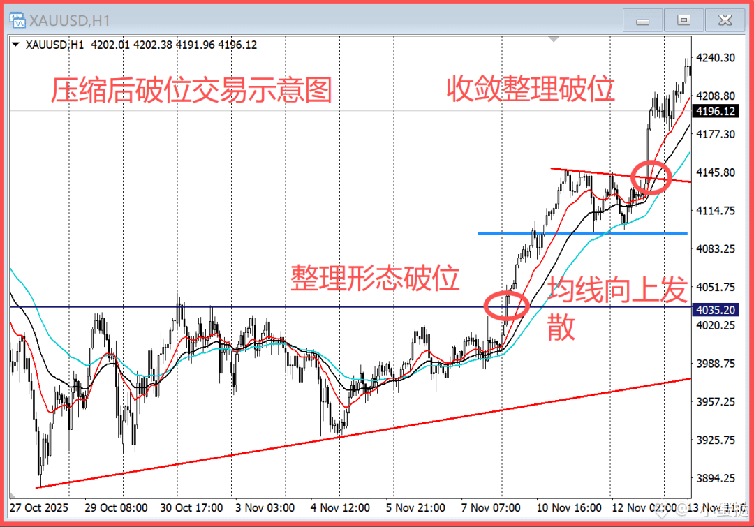 因为均线发散一眼可辨,代表着行情趋势运行;整理三角形整理形态代表着行情中继,两条收缩的趋势线也很简单;破位代表了行情的延续,进场标准清晰唯一。