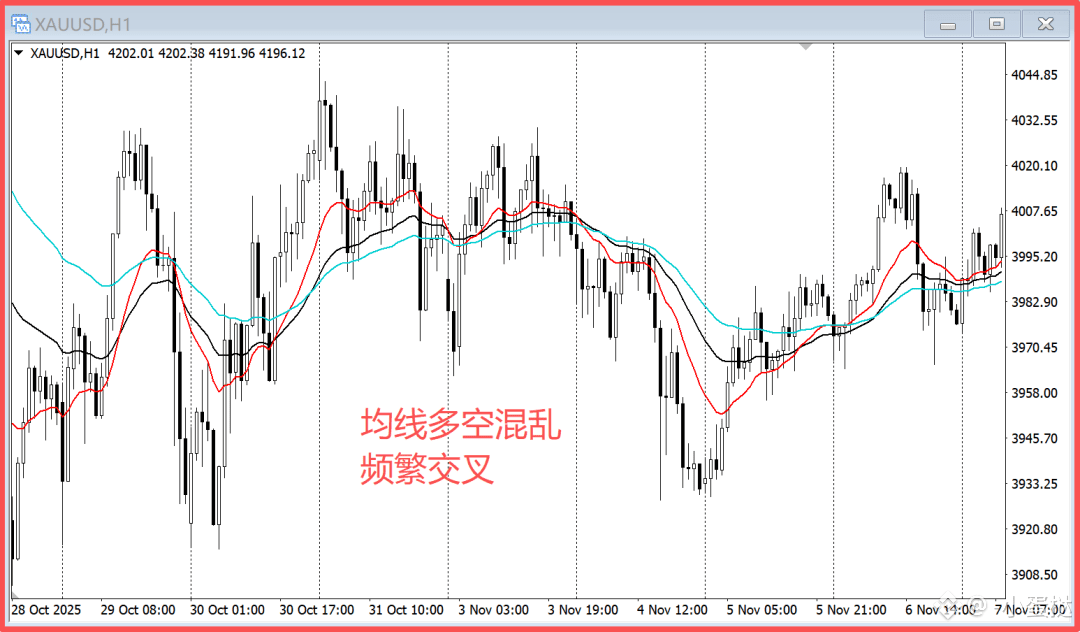 图中是黄金1小时级别的K线图,在整个近8个交易日的走势里,均线多空频繁交叉,方向混乱,高低点不明,很难找到清晰明确的开仓,止损,平仓点。