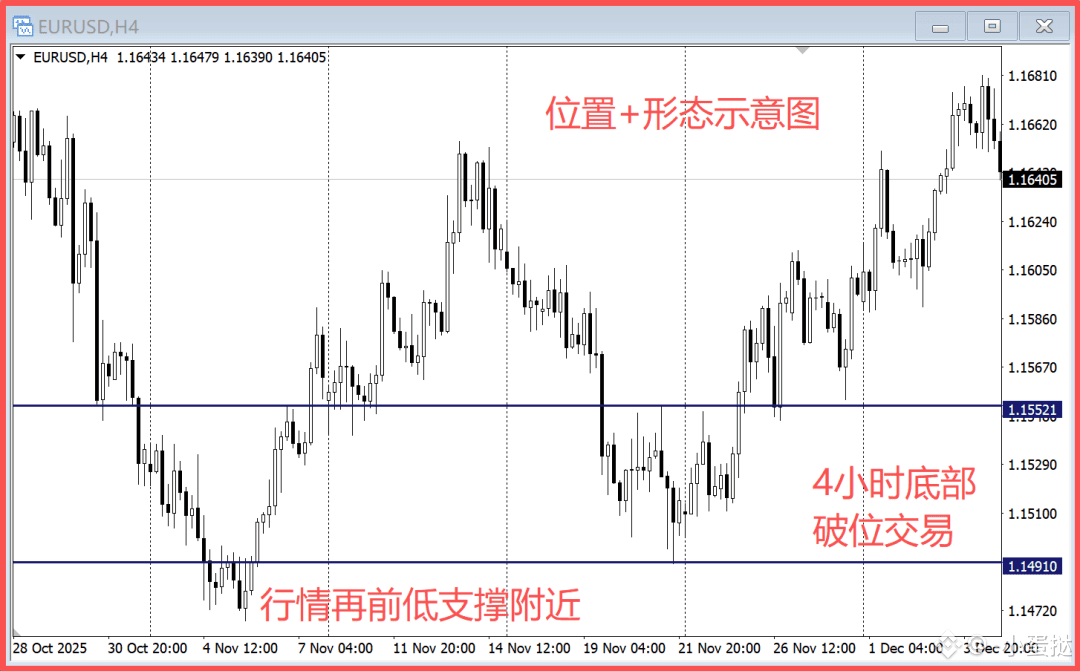 在这个位置,4小时级别形成了一个底部向上破位的形态,破位的价格是1.15521,之后行情大幅上涨。