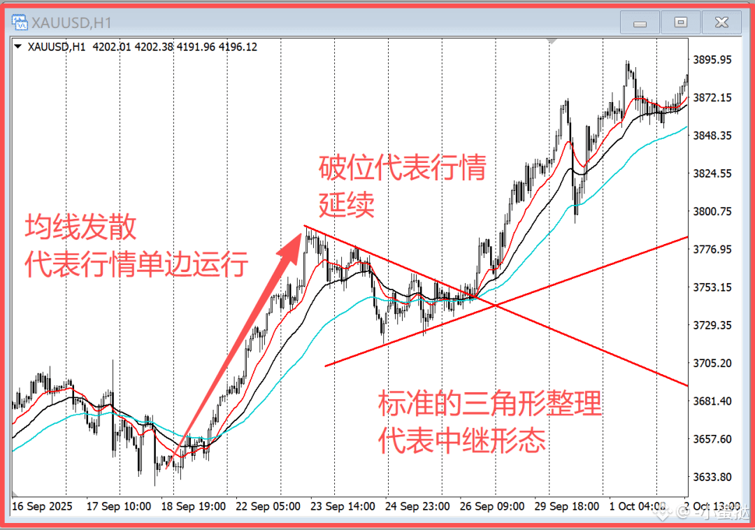 大家看下方的图表,只做均线发散,行情启动后清晰的三角形整理。