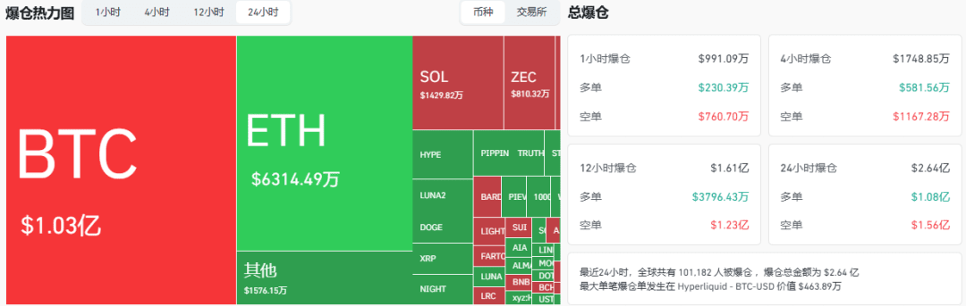 In the last 24 hours, a total of 101,182 people have been liquidated, totaling $264 million, among which the bulls suffered heavy losses ($108 million), and the bears were also not spared ($156 million).