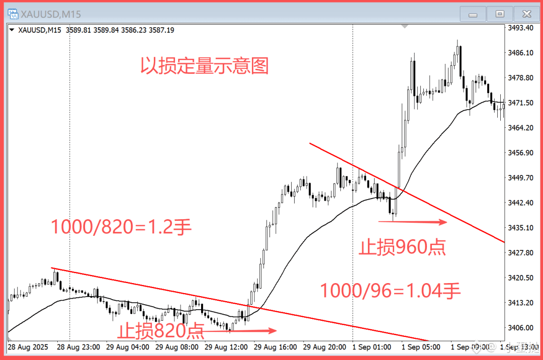 图中是黄金15分钟的K线图,共有两笔交易是以损定量的交易。