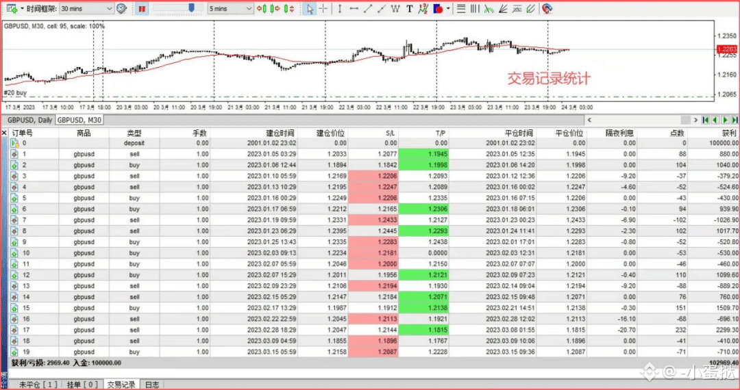 其中成功8次,失败11次,盈亏比设定为2:1,全部开1手,账户为10万美元的模拟账户,最终盈利2969美元。