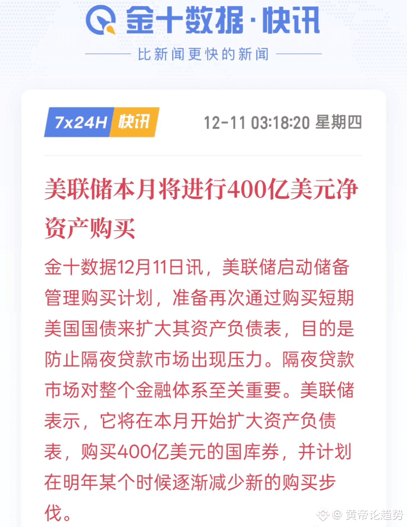 虽然美联储买了400亿美元国债,但别急着认为这是扩表。这400亿其实是RMP操作的一部分,目的不是刺激经济或主动放水,而是为了确保银行体系有足够的准备金,防止年底因为财政部的资金调动、税款缴纳、企业年末结算等因素导致银行体系资金紧张。