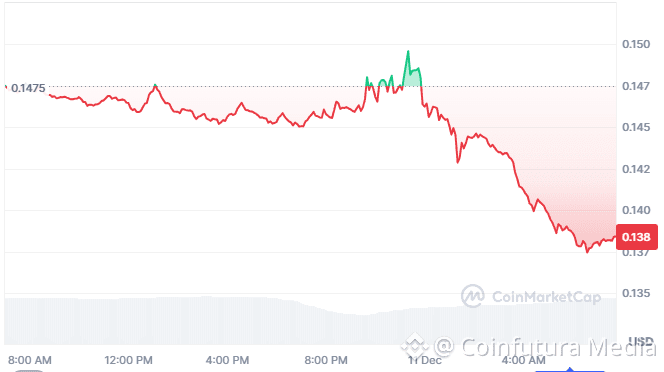 Market sentiment leans cautious as the market cap posts a 6% decrease. The broader structure now moves closer to ranges watched across multi-day charts. The earlier attempted bounce failed to reverse momentum, leaving little sign of an immediate turn. Traders continue watching for any movement back toward the $0.142–$0.145 area.