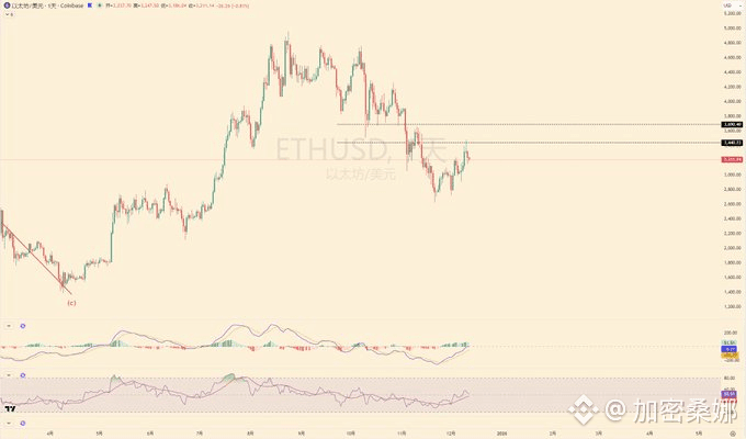 以太坊毫无疑问是这轮反弹的 “领头羊”,MACD 已经回踩完 0 轴,现在碰到第一强压位有点卡壳。
