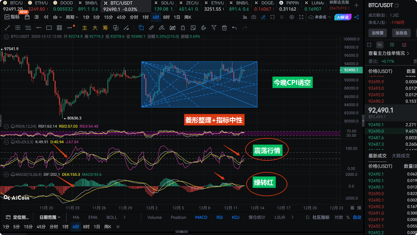 Looking at today's technical details: KDJ is stuck around 50 'playing dead,' RSI is neither overbought nor oversold, only the green bars of MACD are shrinking—this is a signal of 'bullish accumulation,' just like when you're playing a game, and the hero is gathering energy in the grass, looking like nothing is happening, but when they strike, they can take someone out in an instant. The chart indicates 'tonight's CPI may bait shorts,' and I dare to bet: before the CPI data is released tonight, BTC will likely drop to around 90000, scaring away the last batch of retail investors, and then with favorable data, it will break through the upper edge of the diamond, rushing towards 95000 or even 100000.