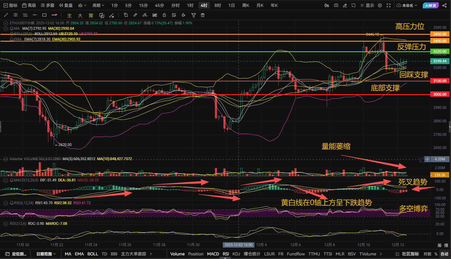 Personally, I think ETH is bullish today, so pay attention to the resistance range of 3400 - 3450. If the volume is sufficient and breaks through this range, the price could reach the limit of 3500 - 3600. At this position, you can consider shorting. From the overall trend at the end of the month, I am bearish, and shorting at this position is the safest.
