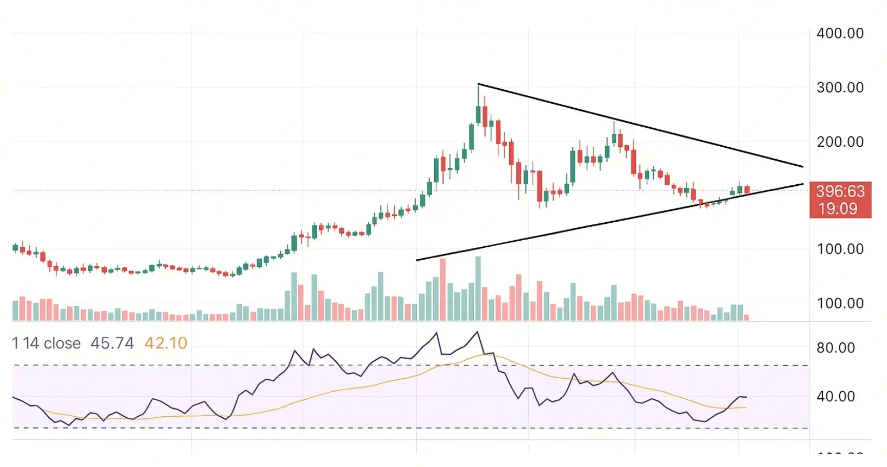 From a technical perspective, the price trend of ZEC has formed a symmetrical triangle shape, and the price is now close to the resistance level of 420 USD. Although it briefly broke through this resistance level this week, it couldn't hold and fell back down. When the price is stuck in this range, the trading volume decreased, and an indicator called RSI has gradually risen from the oversold point (when the price dropped too much) to around 40, indicating that the price has initially stabilized. However, to say that the price will continue to rise, we still need to wait and see.