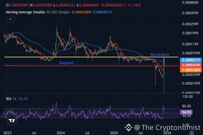Unless trading activity expands and open interest begins to climb, the price is more likely to drift gradually downward. Key support areas lie near $0.000052, followed by $0.000046 and $0.000044 if weakness persists.