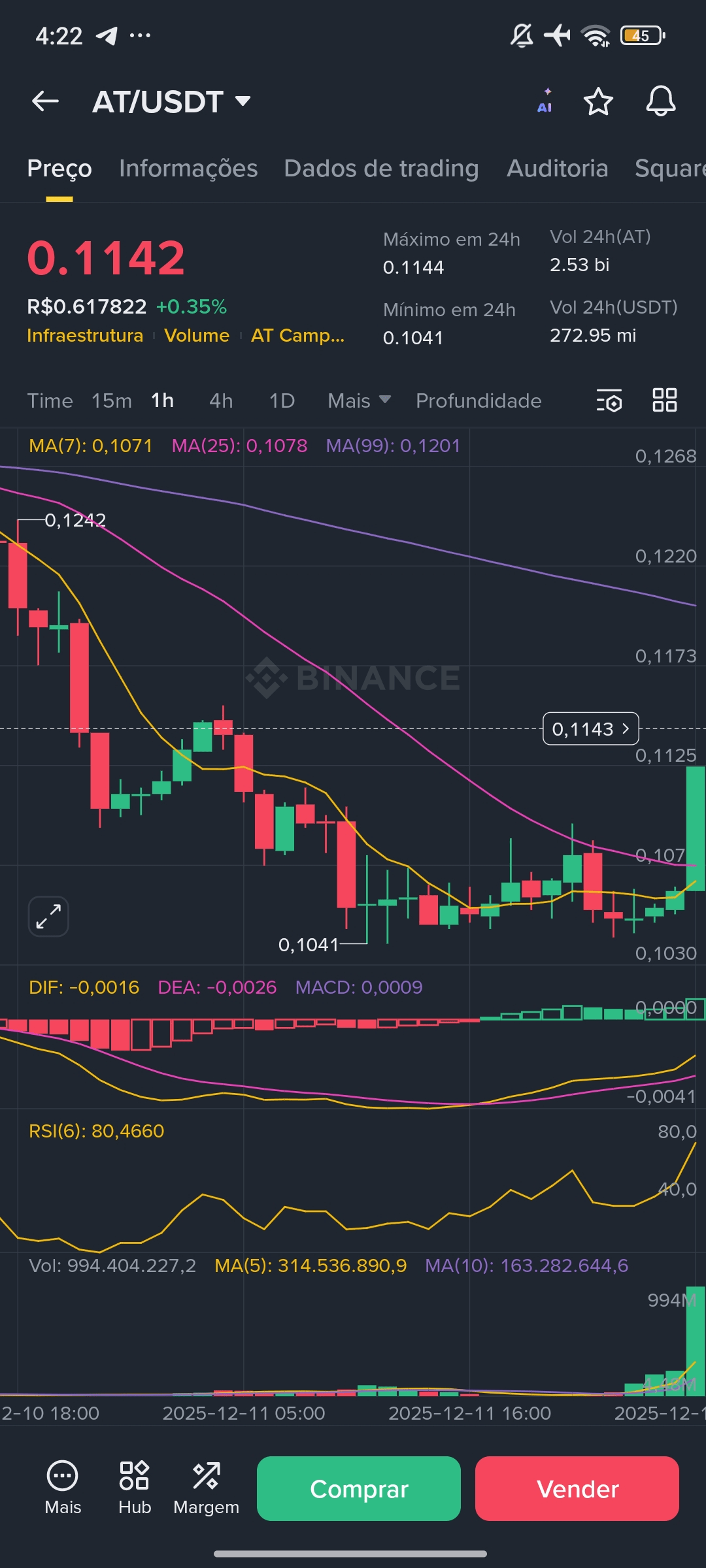 Binance Square Community, pay attention! The AT/USDT chart shows that we are at a moment of maximum tension. The current price, at $0.1142, is caught in a squeeze between the Short and Long-Term Moving Averages. This indecision is what precedes major movements.