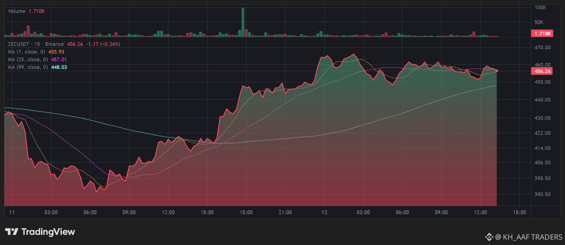 $ZEC اس وقت تقریباً 450–460 ڈالر کے قریب ٹریڈ ہو رہا ہے، جو کل کے مقابلے میں واضح اضافہ ہے۔