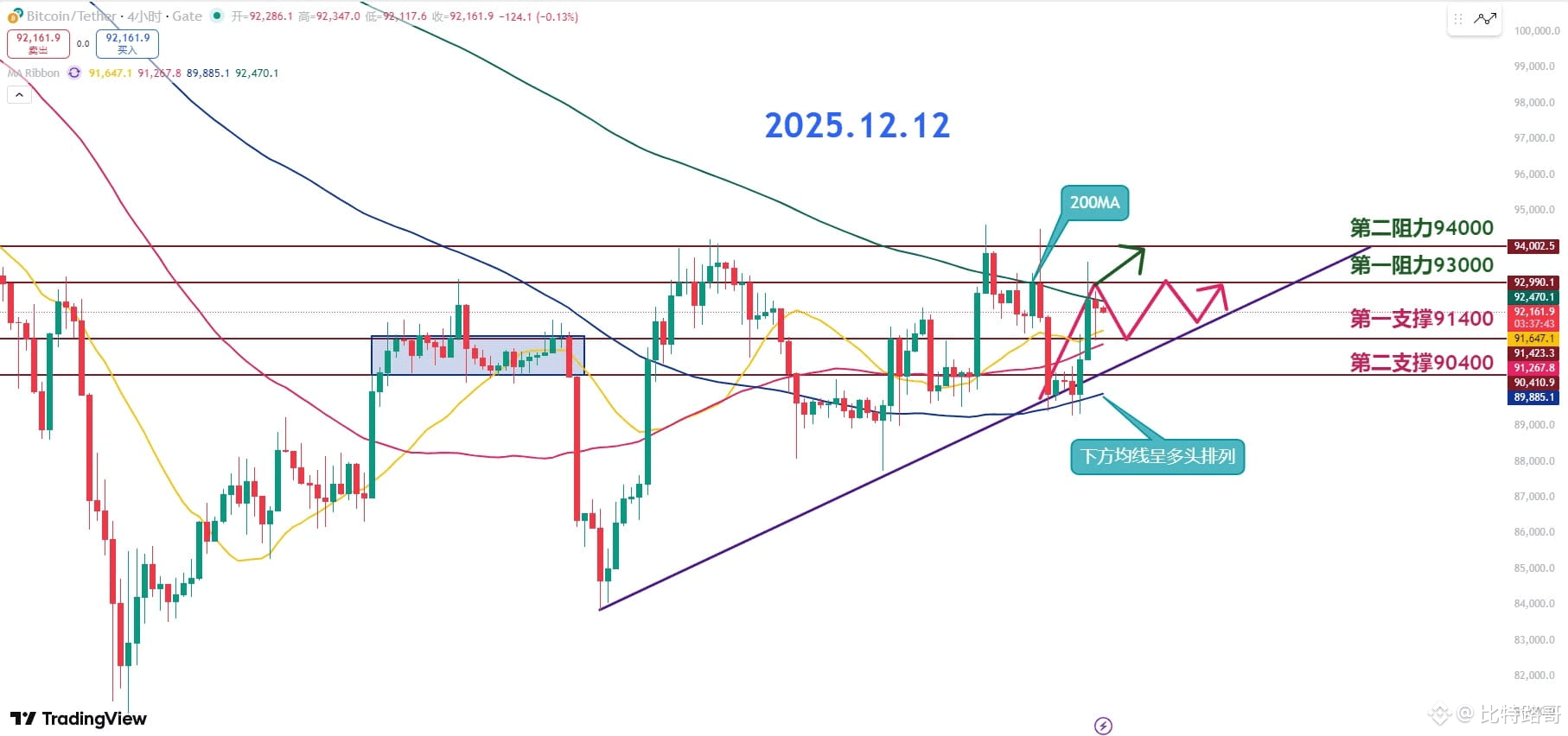 目前的短线是最关键的支撑在91.4K,第一支撑一旦跌破,下面90.4K会是多头最后的防线。特别是 90.4K到91.4K是重要密集成交区,如果再被跌穿,行情马上会切换成下行结构。