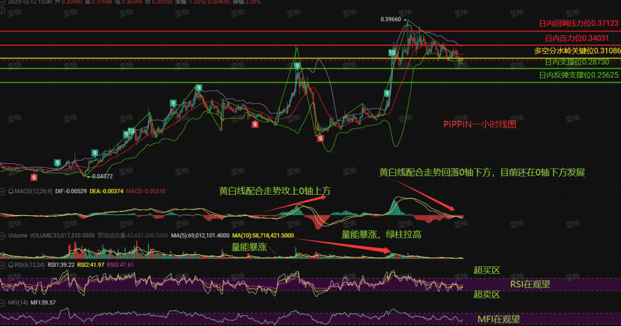 The yellow and white lines are firmly pressing below the zero axis, and the green bars are still expanding, clearly indicating that the bears haven't finished attacking. But do you know what the scariest part is? There are two key support levels below, one at 0.28730 and one at 0.25625. If these two levels can't hold, I can't imagine the consequences...