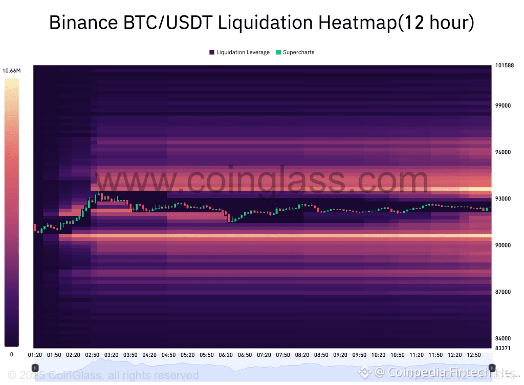 Bitcoin has spent much of the past 12 hours pinned in a narrow band around $93,000, as large pockets of liquidity accumulate above and below the current price. According to Coinglass liquidation data, BTC price is effectively sitting in the middle of a “liquidity sandwich”—a market structure where price gets trapped between two major liquidation magnets.