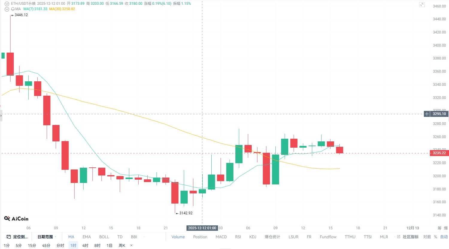 First, the chart is clear at a glance. The price experienced a significant drop initially, but at the position of 3142.92, it clearly came to a stop and showed signs of stabilization and rebound. Currently, this position is stuck in a narrow range, oscillating between 3166 and 3203, which is less than 40 points—a typical consolidation pattern. Looking at the 7-period moving average MA(7) at 3181.33, it is almost flat and in line with the closing price, while the 30-period moving average MA(30) is still pressing down from a high of 3258.82. What does this indicate? The short-term downward trend has paused, showing signs of flattening, but the long-term pressure line is still hanging overhead, and we cannot say the trend has reversed until it breaks through.