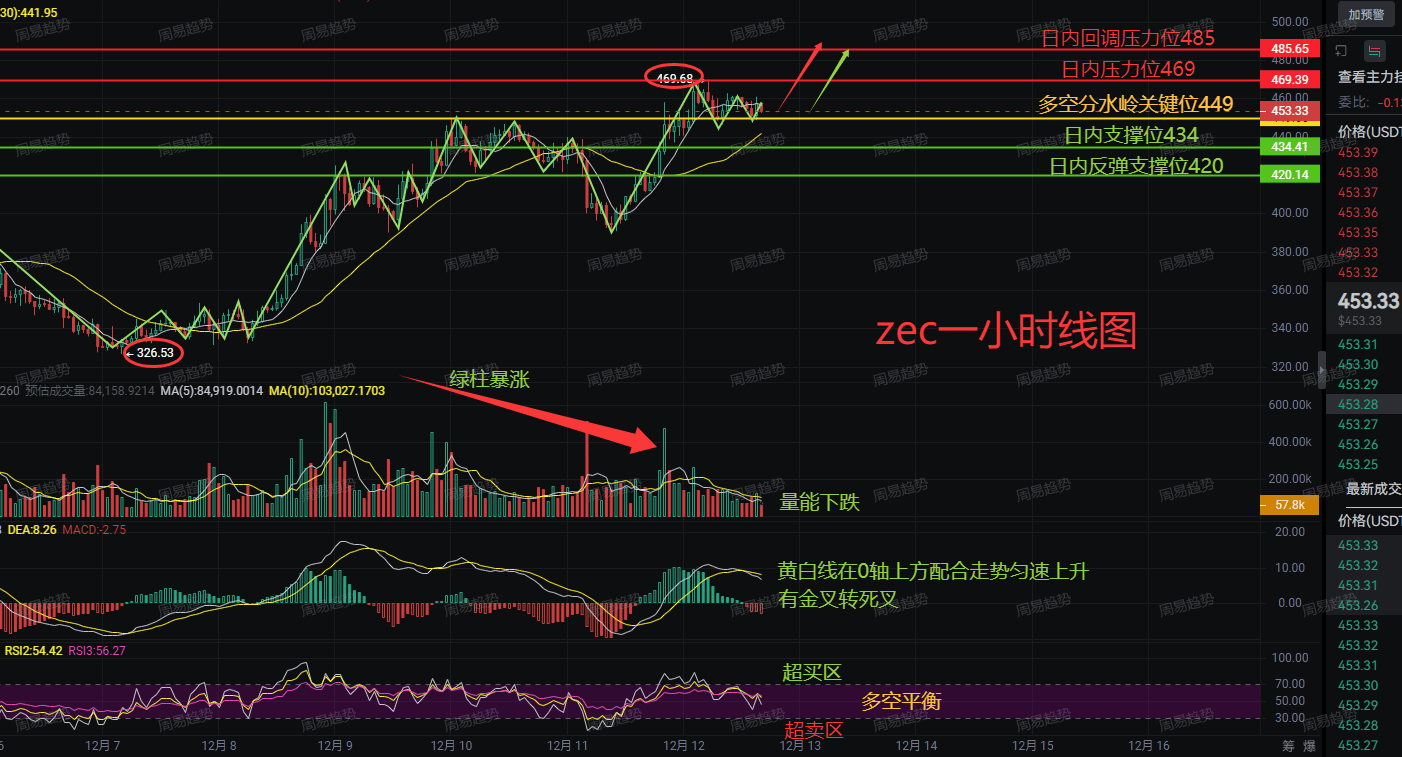 From the 1-hour chart, ZEC is overall in an upward trend. The MACD yellow and white lines are steadily rising above the zero axis, but注意——the golden cross has turned into a dead cross, and the volume is decreasing! This indicates that the upward momentum is weakening, and there is a risk of a short-term pullback. The upper pressure levels are 469 (intraday pressure) and 485 (pullback pressure), while the support below is first seen in the 449-434 range, with strong support at 420.