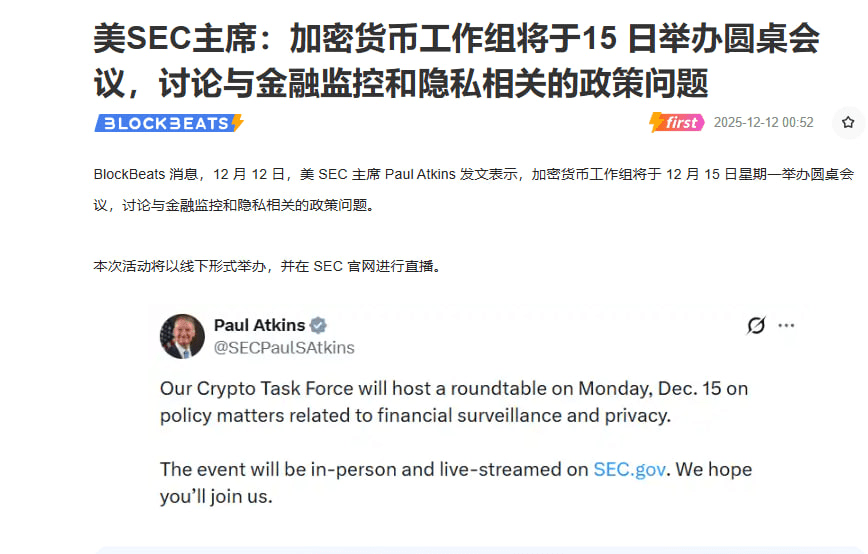 The SEC will hold a cryptocurrency roundtable meeting next Monday (December 15), focusing on "Financial Surveillance and Privacy." As a privacy coin, ZEC is susceptible to sentiment influenced by policy news. If the meeting releases regulatory signals, it may trigger selling pressure; if it is just a discussion, after the negative news lands, ZEC might rebound.